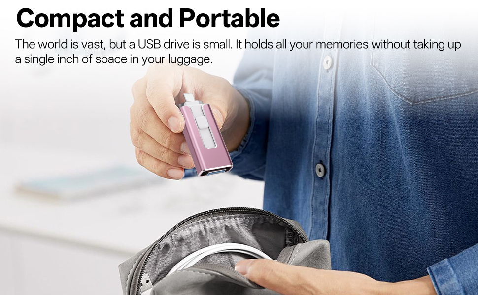4-in-1 Memory Stick for iPhone—-This for iPhone USB Stick Photo Transfer compatible with Apple devices, featuring four ports—Lightnning, Micro USB, USB 3.0, and USB-C—for effortless data transfer between Apple, Android devices, and PCs. Transfer photos and videos directly between your devices without needing cloud storage or an internet connection. The ideal solution for freeing up storage space on your phone.