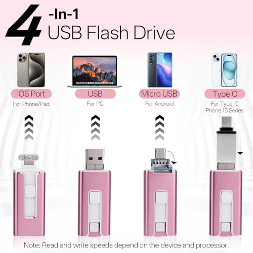 USB Stick 128GB for iPhone, [MFi-certified] 4-in-1 Flash Drive for iphone, Photo Stick for iPhone/iPad/Android/PC, Without App USB 3.0 High-Speed Lightnning Memory Stick Transfer Photos Videos, Pink