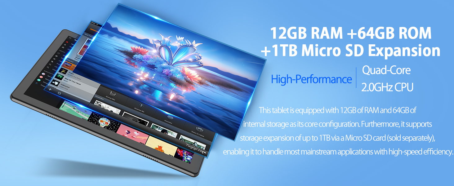 【Good Performance&Expandable Storage】Our android tablet is powered by a stable Quad-Core RK3562 processor clocked up to 1.8GHz. This enables faster app launches, smoother video playback, and overall superior performance. With 12GB(3+9GB Expand) of RAM and 64GB of internal storage (expandable up to 1TB with a TF card,do not included), you can run apps seamlessly and store an extensive collection of files, songs, pictures, videos, and games