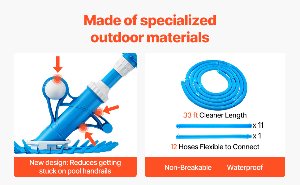 Suitable for Various Pools: Our pool sweeper is ideal for various pool surfaces, including shotcrete, tile, vinyl, fiberglass, and concrete. Adjusting the flow regulator and hose length allows it to move quickly along the pool floor and climb walls to remove debris without getting stuck. Please note that this cleaner is not designed for stairs or large leaves.