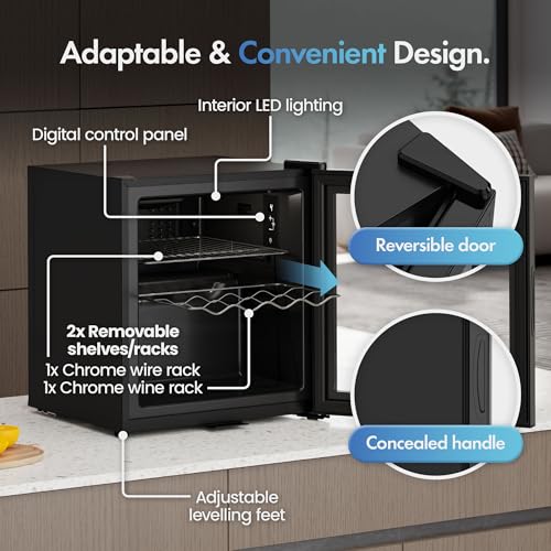 VonHaus Drinks Refrigerator 43L – Mini Wine and Beverage Refrigerators with Reversible Glass Door, Lock & Keys, Table Top with LED Lighting & Adjustable Thermostat 0-20°C – Black [Energy Class D]