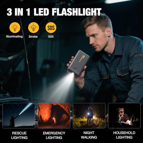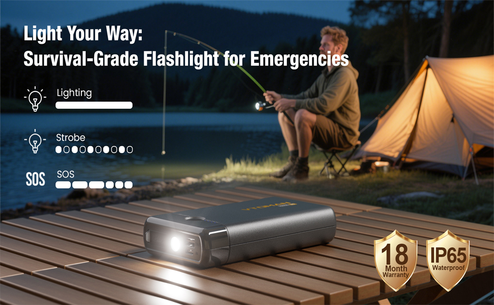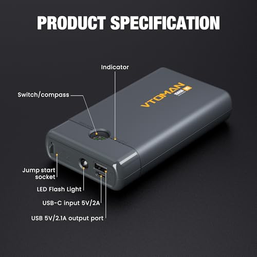 【Easy Illumination and Navigation】The VTOMAN V5 is more than just a car jump starter power bank—it's a reliable travel companion. Equipped with a bright LED flashlight featuring three modes and a built-in compass, this battery jump starter is ideal for emergencies, ensuring you're never left in the dark.