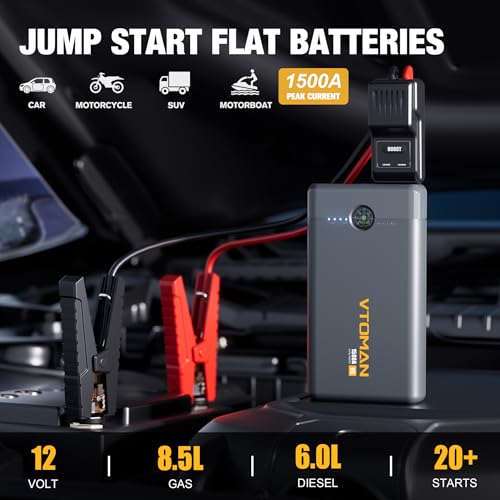 【Car Starting Power】The VTOMAN V5 12V car jump starter delivers a powerful 1500A peak current, capable of starting vehicles with up to 6L gasoline or 4L diesel engines. This versatile battery jump starter pack portable is suitable for a wide range of vehicles, while its design also supports use as a car battery charger 12v in a pinch.