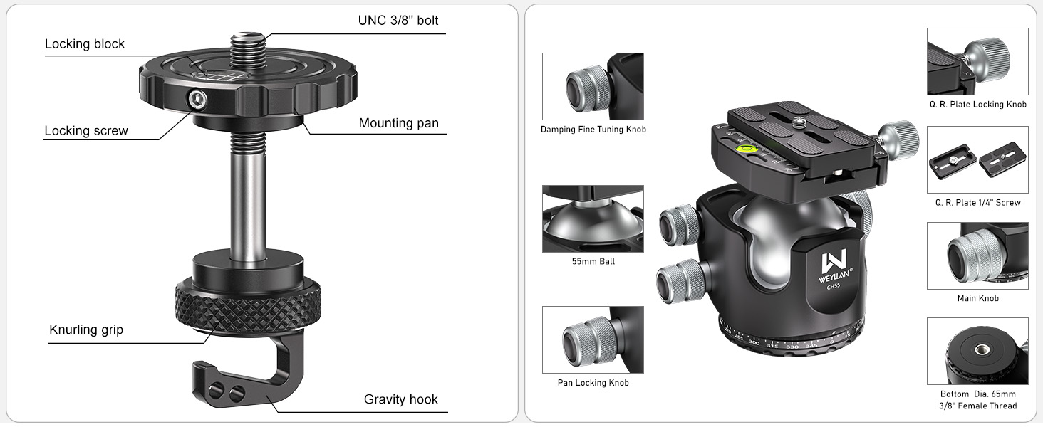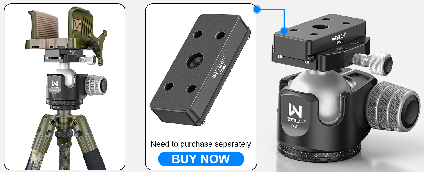 【Premium CNC Construction】The BA5 ball head converter is manufactured with full CNC machining and hard anodized. The screw and locking mechanism are made of stainless steel, and the rest of the parts are made of 6061-T6 aluminum alloy. The CH55 ball head is made of premium aluminum alloy and machined by all CNC technology. It is durable and smooth to use.