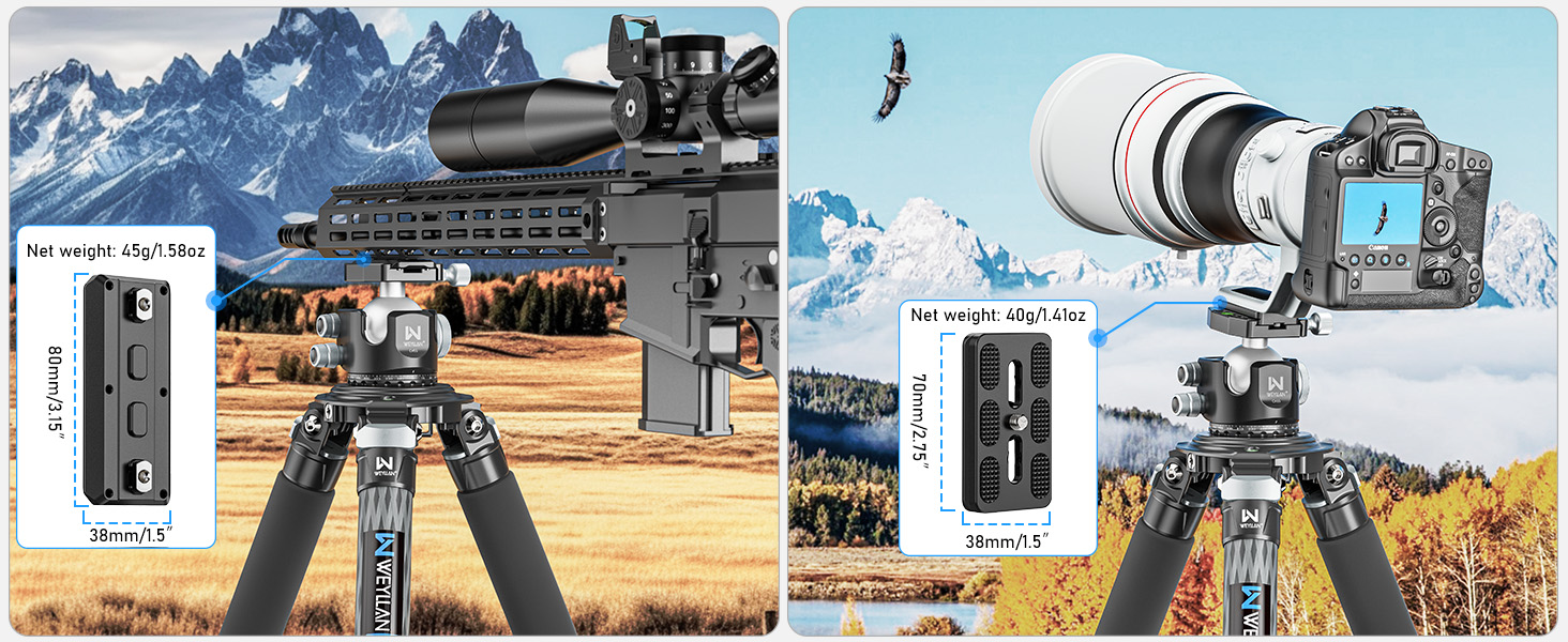 【MLOK Quick Release Plate】This ball head conversion kit includes an MLOK quick release plate and a regular quick release plate. MLOK quick release plate compatible with Arca Swiss and RRS quick release clamp, suitable for all kinds of tripod ball heads. Perfectly compatible with the MLOK system, effectively reduces recoil to ensures more stable shooting.