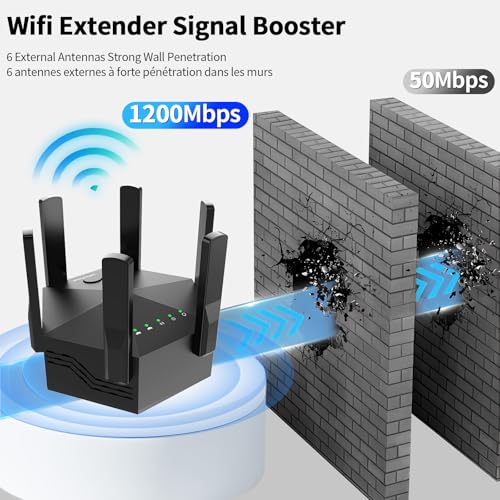 Wifi Extender Booster, WiFi Booster 1200Mbps 6 Antennas Dual Band Expand Wi-Fi Coverage To Your Whole Home, 45 Devices, Wireless Repeater for Home, Internet Booster Black
