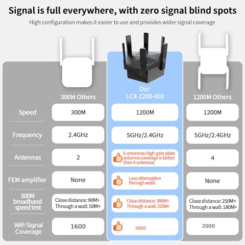 Eliminate WiFi Dead Zones: Our wifi extender booster is equipped with 6 high gain antennas that can penetrate walls and floors expand Wi-Fi coverage to your whole home