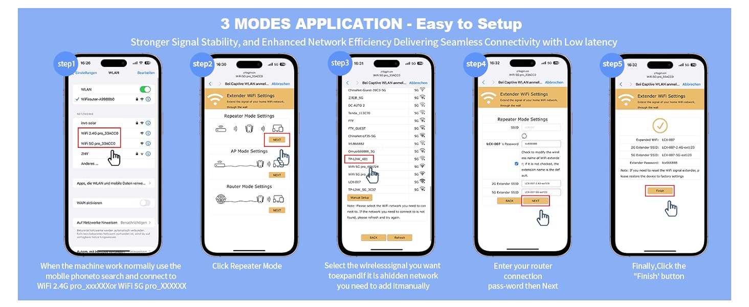 Three Operation Modes – Easy Setup: The wifi extender equipped with an ethernet port and flexible Repeater/AP modes, this internet booster wifi adapts to your needs. Use Repeater mode to seamlessly expand your existing WiFi range, or switch to AP mode to create a brand-new network via Ethernet. Whether you need to broaden coverage or set up a dedicated hotspot, it’s your all-in-one solution