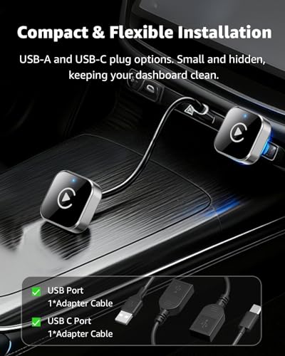 - Revolutionary Mini Design, 50% Smaller – The ultra-compact and elegant Ancvet C99 Wireless Adapter fits almost flush into your car’s USB port and blends seamlessly into the interior. It delivers a clean, minimalist look without messy cables. With our enhanced, nearly invisible adapter, you can effortlessly upgrade your vehicle’s original Apple CarPlay/Android Auto functionality to wireless.