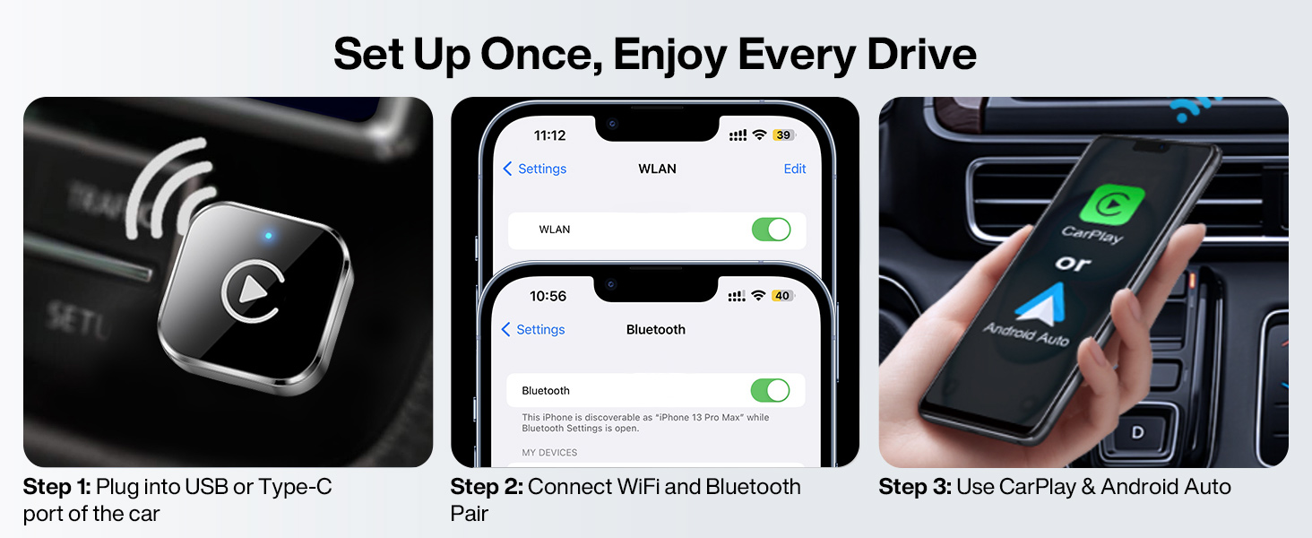 - Plug-and-Play with Instant Auto-Reconnection – No complicated setup required. Simply pair via Bluetooth, and the Ancvet C99 CarPlay Wireless Adapter is ready to go. It automatically reconnects each time you start your car for a seamless experience. Thanks to the latest Bluetooth technology, you get double the speed, and your CarPlay/Android Auto is ready even before the engine starts.