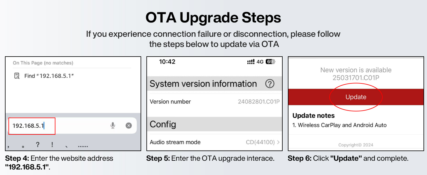 - Future Proof with Online Updates – Free firmware upgrades are available via online update to ensure the CarPlay adapter's software remains compatible with iOS updates