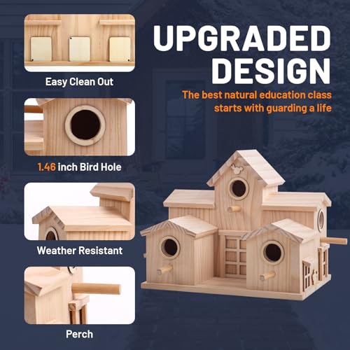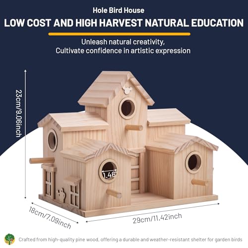 Wooden Birdhouse with Multiple Entry Holes, Natural Pine, Decorative Garden House