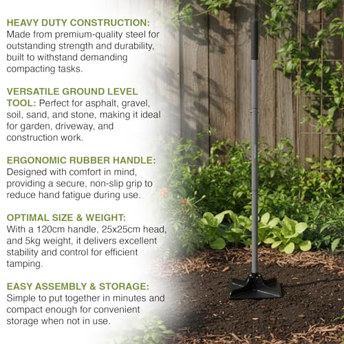 - OPTIMAL SIZE & WEIGHT – With a 120cm handle, 25x25cm head, and 5kg weight, it delivers excellent stability and control for efficient tamping.