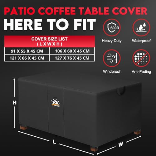 - 600D Heavy-Duty & Waterproof – Made of 600D oxford fabric with PU coating, Zettum heavy duty garden furniture cover for outdoor small size table is tear-resistant, breathable, and waterproof; Our outdoor coffee table cover offering stronger durability than PVC table cover.