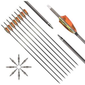 6/12pc Custom Length Feathered Carbon Arrows 300/350/400/500/600/700/800 Spine Removable Tips 3″ Turkey Feather Targeting Hunting Arrow for Traditional Bow Long-Bow Recurve Bow Compound Bow Archery A7 Inner Diameter 6.2mm/0.244″ Carbon Arrow for Indoor Outdoor Target Practice and Hunting Personal CustomizationMax Shaft Length: 33inchesChoose CUSTOM when you need other arrow length or feather color Technical SpecificationShaft Material: 100% carbon fiber tubeStraightness: 0.006″(100 feet drop point dispersion range is about 0.25 inches)Spine: 300 350 400 500 600 700 800Shaft Length: as you choose or CUSTOMTotal Length: about 1.5″ longer than shaft lengthMax Safe Draw Weight:Spine 300 350 400 = 80 poundsSpine 500...
