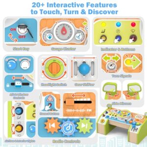 Montessori Wooden Steering Wheel Busy Board for Kids & Toddlers – Interactive Pretend Driving Dashboard with Car Sounds & Lights – Educational Sensory Learning Toys Gift for Boys Girls Preschool Ages Check Offer Price Immersive Pretend Driving Fun: Give little drivers a realistic pretend driving experience with this Montessori Wooden Steering Wheel Toy. The dashboard features a turning wheel, start key, gear shifter, turn signals, mirrors and switches—perfect for toddler learning activities, pretend play, and helping children build confidence, imagination, and early social skills while they "drive like mom & dad." Light-Up & Sound-Enhanced Sensory Toy (12 Vehicle Sounds +...