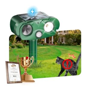 Upgraded Cat Repellent for Gardens UK【Dual Ultrasonic Emitters & Infrared Sensor-SFE Certified】【Efficient Monocrystalline Solar Panel Powered】Fox Deterrents for Gardens uk for Outdoor(Green) Check Offer Price 【Dual Ultrasonic + Infrared Sensing】Equipped with dual ultrasonic transmitters and advanced infrared sensors, the cat repellent for gardens uk detects movement within a 12.8-metre range and 120.5° wide-angle field. It intelligently distinguishes between irrelevant environmental disturbances and genuine targets, triggering precise ultrasonic pulses only when necessary. Day and night, it safeguards gardens, bins, and vehicles from animal intrusion. ⚡【Solar + Type-C Dual Power Supply】 Features industry-leading monocrystalline silicon solar panels (23% conversion efficiency!) paired with...