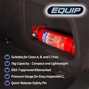 1KG ABC Dry Chemical Powder Fire Extinguisher | with Steel Wall Bracket | Fire Extinguisher for the Home or Ca Be Prepared for an emergency with Equip's ABC Dry Powder Fire Extinguishers. Suitable for use in the home, office, vehicles, boats and many commercial and industrial applications. Suitable for use on A, B, C Class fires, and fires involving electrical equipment. Equip 1Kg Fire Extinguisher with wall bracket EQUIP – For the Journey Ahead Equip supply the highest quality car accessories to keep you going whatever the journey. With interior and exterior accessories to make your journey more convenient and...